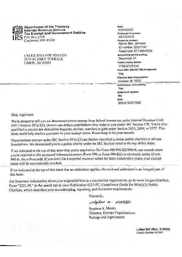 We’re a charity-based organization that feeds needy children and provides them with clothes, sanitary materials, school tuition and school supplies. Uncle Joe’s Foundation is a registered non-profit in the State of New Jersey.